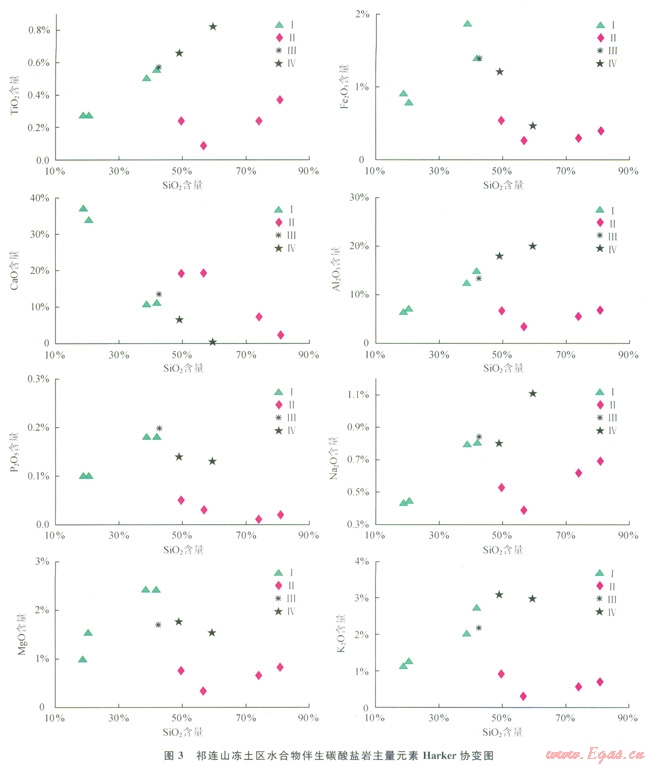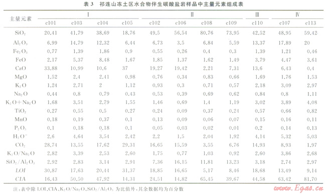 近幾年,在祁連山凍土區(qū)水合物科學(xué)試驗(yàn)鉆探過程中,觀察到大量與水合物伴生的碳酸鹽礦物,這些伴生碳酸鹽礦物(或部分)是否與水合物存在著某種成因上的聯(lián)系,還不得而知。由于碳酸鹽礦物?;煊兴樾汲练e且難以與碎屑沉積分選開來,筆者以祁連山凍土區(qū)新近發(fā)現(xiàn)的與水合物伴生碳酸鹽礦物及其混雜的碎屑沉積(統(tǒng)稱碳酸鹽巖)為研究對象,從分析伴生碳酸鹽礦物所在沉積巖中主量元素、微量元素、稀土元素等特征入手,探討伴生碳酸鹽礦物可能物質(zhì)來源與沉積條件,試圖揭示不同產(chǎn)狀伴生碳酸鹽巖同水合物的內(nèi)在成因聯(lián)系。