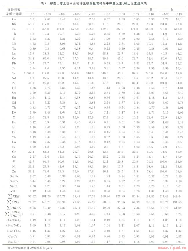 野外鉆探取樣過程中發(fā)現(xiàn)水合物常與碳酸鹽巖伴生,這一現(xiàn)象暗示了水合物可能與碳酸鹽巖之間存在著某種聯(lián)系。海底水合物分布區(qū)中伴生碳酸鹽巖中的碳普遍認(rèn)為主要來源于水合物分解釋放的甲烷,其次還可能來源于滲漏的甲烷氣體,或深部滲漏的重?zé)N(油)、沉積物中有機(jī)質(zhì)等被氧化產(chǎn)物。對祁連山凍土區(qū)伴生碳酸鹽巖中C、O同位素研究表明,第Ⅰ、Ⅲ、Ⅳ類伴生碳酸鹽巖巾碳、氧同位素組成相關(guān),而第Ⅱ類伴生碳酸鹽巖中碳、氧同位素組成相對獨(dú)立,第Ⅱ類伴生碳酸鹽巖組成明顯不同于第Ⅰ、Ⅲ、Ⅳ類伴生碳酸鹽巖[31],其伴生碳酸鹽巖礦物如方解石、文石、白云石中13C較大程度虧損指示著甲烷是其碳酸鹽巖的一個主要碳源[32-33]。顯微鏡下觀察發(fā)現(xiàn),第Ⅱ類碳酸鹽巖中產(chǎn)出較多草莓狀黃鐵礦,這些特征表明有微生物參與沉積成巖,這也造成第Ⅱ類碳酸鹽巖元素地球化學(xué)特征有別于其他類型碳酸鹽巖。