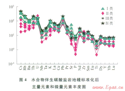巖石化學(xué)蝕變指數(shù)(CIA)——CIA指數(shù)=[Al2O3/(A12O3+CaO+Na2O+K2O)]×100,表達(dá)了Al2O3(含鋁黏土礦物)、(CaO+Na2O)(斜長石)和K2O(鉀長石)含量之間的變化關(guān)系,反映出沉積烴源巖特征[27]。該區(qū)4類碳酸鹽巖樣品中CIA指數(shù)分別約為32、36、44、72,第Ⅰ類和第Ⅱ類碳酸鹽巖中混入的碎屑部分程度最弱,因?yàn)檫@個原因,第Ⅱ類碳酸鹽巖樣品中稀土元素含量最低(其平均約為l03.61mg/g,而第Ⅰ、Ⅲ、Ⅳ類碳酸鹽巖樣品中稀土元素含量分別約為137.48mg/g、197.83mg/g、230.07mg/g),其樣品中主量元素和微量元素含量也相對最低(表3、4),即表明黏土礦物對該類碳酸鹽巖形成過程中的貢獻(xiàn)最小。