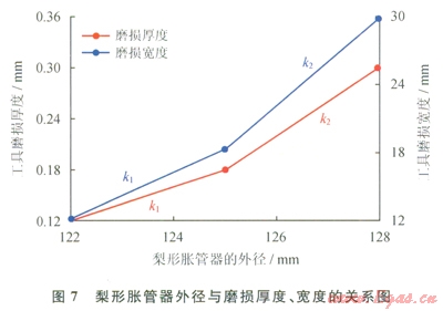 由圖6和表3可知,整形后梨形脹管器工作面的磨損寬度和磨損厚度均隨著工具外徑的增加而增加;由圖7可知,梨形脹管器的磨損量隨著級差的增加而呈非線性增加,表明工具根據(jù)變形套管之間的級差對梨形脹管器的磨損量有很大的影響。因此,為了減小對工具的磨損,應(yīng)該適當(dāng)減小梨形脹管器之間的級差。