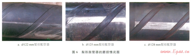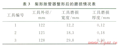 由于在整形過程中梨形脹管器與套管內(nèi)壁發(fā)生了較大的摩擦接觸,造成梨形脹管器發(fā)生了不同程度的磨損(圖6)。通過用游標(biāo)卡尺對整形后梨形脹管器的磨損寬度和厚度進(jìn)行測量,可以得到梨形脹管器的磨損量,其具體的磨損結(jié)果見表3。