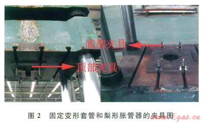 3)在萬能液壓試驗機(jī)(YS32-500)上安裝與梨形脹管器和變形套管相匹配的頂部、底部夾具(圖2)。