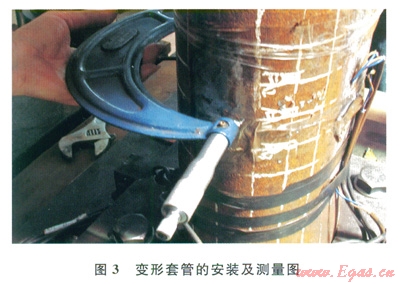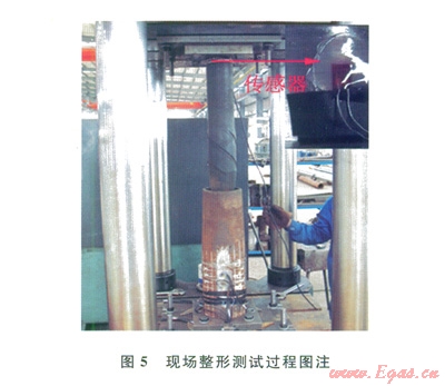 6)開始整形測試(圖5)。在整形的過程中要求梨形脹管器在套管變形處往得移動直到配合接頭上的壓應(yīng)變趨于0為止,即梨形脹管器可以在變形套管內(nèi)自由滑動,此時我們可以認(rèn)為變形套管的內(nèi)徑等于梨形脹管器的最大外徑,同時測量變形套管整形后的尺寸,完成l只梨形脹管器的整形實驗;第2只和第3只梨形脹管器重復(fù)上述步驟完成。