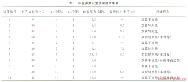 在定向射孔方位角由小變大的過程中,發(fā)現(xiàn)存在一個(gè)臨界角度,此時(shí),定向射孔處和最大水平地應(yīng)力方向處的第一主應(yīng)力的大小相等,裂縫可能會(huì)同時(shí)在這兩個(gè)位置起裂[1,3]。實(shí)驗(yàn)表明:在試件4、試件7和試件10中產(chǎn)生了非對(duì)稱多裂縫系統(tǒng),井眼一側(cè)是一條沿定向射孑乙起裂的轉(zhuǎn)向裂縫和一條白射孔孔眼根部與井壁的交匯處起裂、穿透水泥環(huán)一段距離后沿sH方向與井壁的交匯處起裂、延伸的單翼平直裂縫,井眼的另一側(cè)是沿定向射孔起裂的轉(zhuǎn)向裂縫(圖3)。而且在地應(yīng)力狀態(tài)一定的情況下,隨著定向射孔方位角的增大,由于水力裂縫的起裂困難和彎曲,產(chǎn)生人工水力裂縫所需的破裂壓力逐漸變大、水力裂縫的轉(zhuǎn)向半徑也越來越大;在產(chǎn)生非對(duì)稱多裂縫時(shí),破裂壓力和裂縫轉(zhuǎn)向半徑均達(dá)到實(shí)驗(yàn)的最大值(表1)。