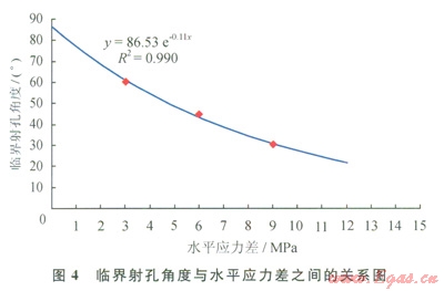 利用本壓裂模擬實(shí)驗(yàn)結(jié)果,可回歸出產(chǎn)生非對(duì)稱多裂縫系統(tǒng)的臨界射孔角度和水平應(yīng)力差的相互關(guān)系曲線(圖4)。當(dāng)水平應(yīng)力差和定向射孔方位角的坐標(biāo)落在藍(lán)色臨界線的左下側(cè)時(shí),人工水力裂縫會(huì)沿定向射孔方向起裂,形成一條基本對(duì)稱的雙翼平直裂縫或雙翼彎曲裂縫;當(dāng)水平應(yīng)力差和定向射孔方位角的坐標(biāo)落在藍(lán)色臨界線的右上側(cè)時(shí),人工水力裂縫會(huì)沿著最大水平地應(yīng)力方向起裂,產(chǎn)生一條穿過微環(huán)面的雙翼平直裂縫;當(dāng)水平應(yīng)力差和定向射孔方位角的坐標(biāo)正好落在藍(lán)色臨界線上時(shí),人工水力裂縫可能沿著定向射孔方向和最大水平地應(yīng)力方向多點(diǎn)同時(shí)起裂,形成非對(duì)稱多裂縫系統(tǒng)。該預(yù)測(cè)結(jié)果與本文參考文獻(xiàn)[3]的有限元模擬計(jì)算結(jié)果比較一致。運(yùn)用該圖可以用來預(yù)測(cè)定向射孔水力壓裂裂縫形態(tài),為現(xiàn)場(chǎng)壓裂施工提供參考。但鑒于實(shí)際地層因素和完井因素的影響,實(shí)際的臨界射孔角度可能會(huì)有所變化。