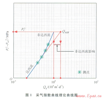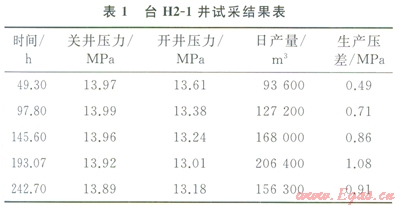 接著用采氣指數(shù)法對該井進行滲流動態(tài)描述[3]。該方法主要根據(jù)滲流力學(xué)原理,將氣體滲流控制在達西流的范圍內(nèi),以達到保護儲層、避免出砂的目的。根據(jù)臺H2-1井的試采數(shù)據(jù),其臨界點在生產(chǎn)壓差lMPa(即地層壓力的7%左右),在此生產(chǎn)壓差下其日產(chǎn)量為16×104m3,也即理論上的最高配產(chǎn)量(圖1)。