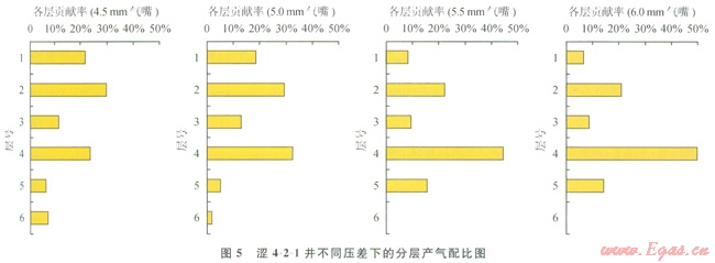 該技術(shù)需要首先進行地質(zhì)研究,根據(jù)地層系數(shù),得到各層理論產(chǎn)出配比情況。研究結(jié)果認(rèn)為:4、5號層為該井的主力氣層。然后根據(jù)不同工作制度序列,進行產(chǎn)氣剖面測試,獲得不同壓差下的分層相對產(chǎn)氣配比情況(圖5)。