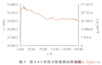 如澀4-4-3井,2008年6月關(guān)井測壓力恢復(fù)曲線(圖3)。關(guān)井期間,套管處于開井生產(chǎn)狀態(tài),從壓力曲線上看,關(guān)井初期壓功處于上升趨勢,從關(guān)井l.5h后開始壓力處于上下波動中,但整體上處于下降趨勢,判斷油套密封性不嚴(yán)。