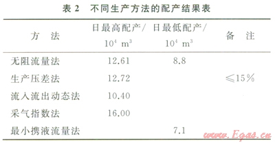 氣井的最小攜液產(chǎn)量也是配產(chǎn)的重要考慮參數(shù)。該參數(shù)用以保證氣井生產(chǎn)時井筒不產(chǎn)生積液。臺H2-1井分別采用73mm、60.3mm、48.3mm這3種規(guī)格的油管進行模擬計算,得出其最小臨界攜液日產(chǎn)量分別為7.1×104m3、4.9×104m3和3.2×104m3。目前該井使用的為73mm油管,確定其最小臨界攜液流量為7.1×104m3/d。通過以上幾種方法配產(chǎn)方法,其匯總結(jié)果如表2所示。