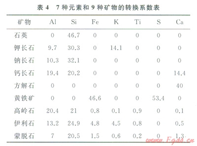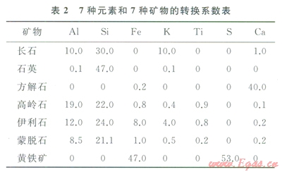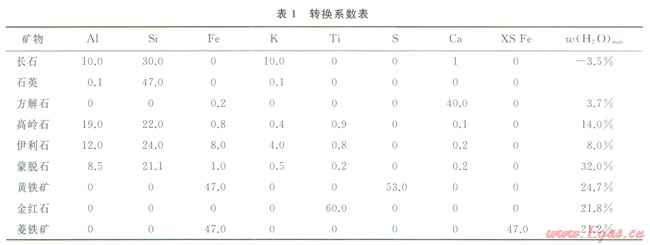 表l是Herron等人給出的一個9種礦物的轉換系數(shù),其中的XS Fe表示剩余鐵,w(H2O)min表示礦物中的水含量。