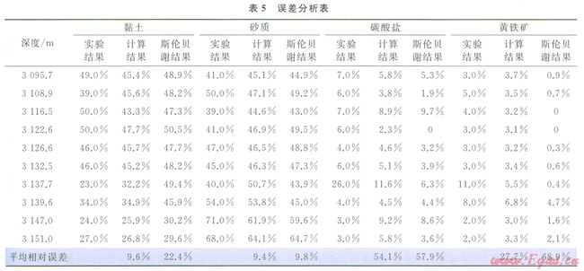 表5是對幾種主要礦物含量計算結果的誤差分析。從表5中可以看出,對于含量大于20%的黏土和砂質,筆者計算的礦物含量的平均相對誤差分別為9.6%和9.4%,均小于10%。雖然碳酸鹽和黃鐵礦的平均相對誤差較大,但由于這兩種礦物含量較少,這樣的結果也是可以接受的。與斯倫貝謝Spectrolith模型計算的結果相比,筆者計算的4種礦物的平均相對誤差均小于斯倫貝謝計算結果。