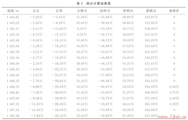 該井ECS資料只有Al、Si、Fe、Ca、S、Ti、Gd(微量元素)7種元素,可用于上述轉換系數(shù)的只有前6種元素,K元素含量可以通過自然伽馬能譜測井獲得。由于缺少XS Fe和w(H2O)min數(shù)據(jù),且全巖分析資料顯示該井段基本不含金紅石和菱鐵礦,所以將轉換系數(shù)初步修正為7種礦物對應7種元素的轉換系數(shù)(表2)。經(jīng)檢驗,修正后的[C]矩陣仍然是方陣,且可逆。表3為通過公式[E]=[C][M],利用最小二乘法計算得到的部分結果。
