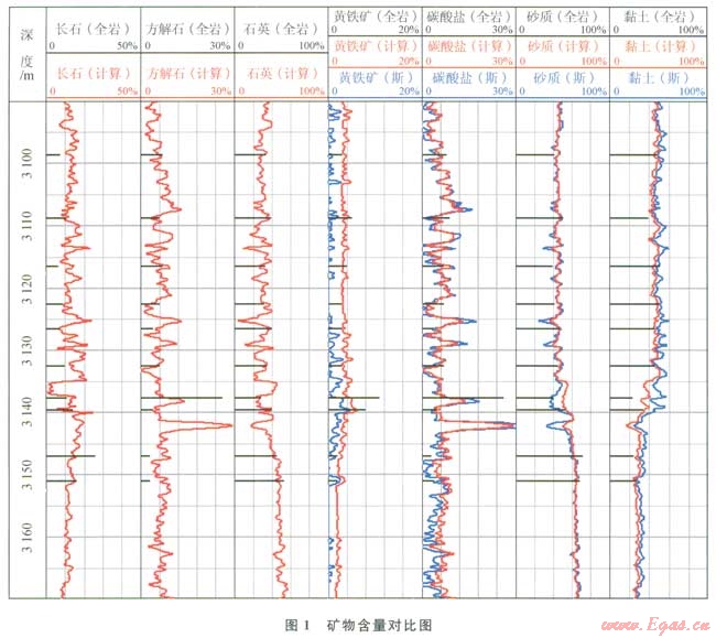 圖1中藍色曲線是斯倫貝謝利用Spectrolith模型計算得到的礦物含量,該模型通過Si、Ca、Fe 3種元素取代Al元素來做精確的黏七估算,而不再需要測量Al的含量。即