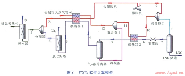 通往膨脹機(jī)的膨脹氣流F1經(jīng)過(guò)換熱器l后溫度降低,然后進(jìn)入膨脹機(jī)膨脹降溫降壓,與LNG儲(chǔ)罐排出的低溫天然氣匯合后通過(guò)換熱器2,然后與氣一液分離器分離出的冷凝液混合后通過(guò)換熱器1,為液化氣流F2提供冷量后溫度升到常溫,進(jìn)入城市管網(wǎng)(圖1中紅色線條部分)。