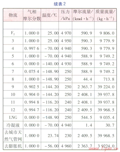調(diào)試流程直至收斂,得到計(jì)算結(jié)果見(jiàn)表2,LNG及去城市管網(wǎng)天然氣組成見(jiàn)表3。