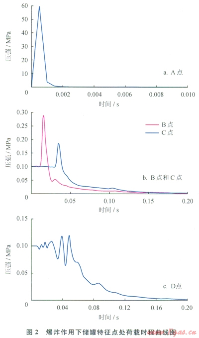儲(chǔ)罐各特征點(diǎn)處在爆炸作用下的荷載時(shí)程曲線(xiàn)如圖2所示,由于E、F兩點(diǎn)距離爆心較遠(yuǎn),其超壓現(xiàn)象不明顯,本文并未示出這兩點(diǎn)的相應(yīng)曲線(xiàn)。比較前3個(gè)特征點(diǎn)的荷載時(shí)程曲線(xiàn),其極值分別為59.15MPa、0.28MPa和0.18MPa;峰值出現(xiàn)時(shí)間分別為0.5ms、15.1ms和35ms;正壓區(qū)作用時(shí)間分別為2ms、8ms和10.5ms。本文參考文獻(xiàn)[14]中給出了裝藥密度為1630kg/m3時(shí)TNT炸藥所形成空氣沖擊波的初始值,其初始波后壓力為54.35MPa,傳播速度為6450m/s.
