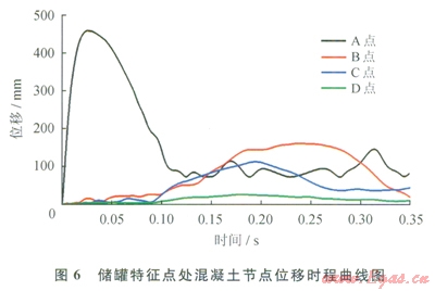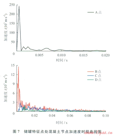 圖7為儲(chǔ)罐特征點(diǎn)A~D處混凝土節(jié)點(diǎn)加速度時(shí)程曲線(xiàn)。由圖7可見(jiàn),各點(diǎn)加速度峰值均出現(xiàn)在初始加載階段,而后反應(yīng)大幅下降,并伴有鋸齒形劇烈振蕩,振蕩現(xiàn)象隨著爆心距的增加而愈加劇烈。這一現(xiàn)象的原因?yàn)檎ㄋ幈ê蠼o儲(chǔ)罐穹頂一個(gè)極大的初始加速度荷載,引起各特征點(diǎn)處加速度出現(xiàn)一個(gè)脈沖峰值,而后出現(xiàn)的鋸齒形振蕩則是由儲(chǔ)罐的自振引起的。將圖5~7與圖2的荷載時(shí)程曲線(xiàn)相對(duì)比,叮以看出,沖擊波波陣面的傳播對(duì)混凝土單元的應(yīng)力影響很大,但對(duì)于其加速度響應(yīng)影響不大。以C點(diǎn)為例,其荷載峰值出現(xiàn)在35ms處,此時(shí)其相應(yīng)的應(yīng)力出現(xiàn)了一個(gè)脈沖峰值,而其加速度響應(yīng)未有明顯波動(dòng)。