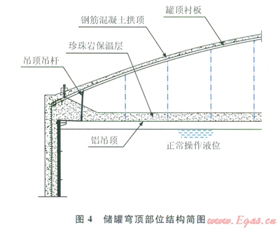 若出現(xiàn)彈坑,空氣沖擊波會(huì)從彈坑中進(jìn)入罐體內(nèi)部,其作用范圍可從罐頂?shù)竭_(dá)罐體內(nèi)部約l5m處。特大型LNG儲(chǔ)罐的設(shè)計(jì)液位高度為34.760m,距離爆心約18m,空氣沖擊波的作用范圍與此十分接近。特大型LNG儲(chǔ)罐穹頂部位結(jié)構(gòu)簡(jiǎn)圖如圖4所示。