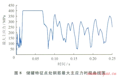 儲(chǔ)罐部分特征點(diǎn)B處鋼筋最大主應(yīng)力時(shí)程曲線(xiàn)如圖8所示,由于爆心處A點(diǎn)的鋼筋瞬間即達(dá)到設(shè)定的應(yīng)變極限不具代表性,故此處并未示出。圖8顯示B點(diǎn)的鋼筋一直處于較高的應(yīng)力水平,最大應(yīng)力已達(dá)到400MPa,但是未達(dá)到設(shè)置的應(yīng)變極限0.05,故尚未破壞,初始爆炸沖量并未使其到達(dá)應(yīng)力極值,后續(xù)的空氣沖擊波持續(xù)作用使其應(yīng)力逐漸增加。外罐鋼筋除爆心處發(fā)生破壞外,其余部分即使有瞬間到達(dá)應(yīng)力限值,但未達(dá)到設(shè)定的應(yīng)變極限,總體來(lái)說(shuō),外罐鋼筋應(yīng)力響應(yīng)較安全。