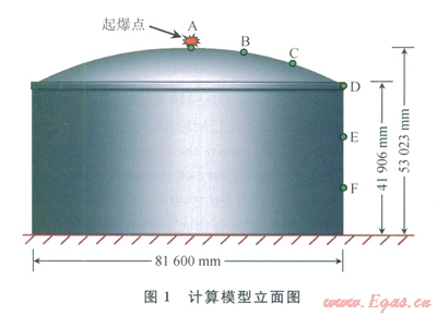 筆者應(yīng)用流固耦合AKE算法和LS-DYNA有限元程序?qū)佑|爆炸作用下特大型LNG儲(chǔ)罐的動(dòng)力響應(yīng)進(jìn)行了數(shù)值模擬分析,根據(jù)前期工作分析,選取900kg TNT當(dāng)量炸藥作為分析載荷。計(jì)算結(jié)果表明: