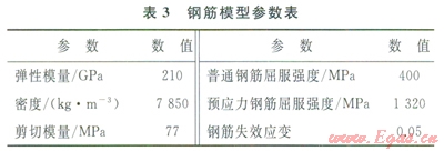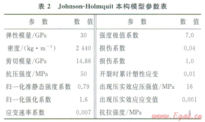 混凝土采用Johnson-Holmquit本構(gòu)模型,模型參數(shù)見(jiàn)表2。該模型因綜合考慮了損傷、應(yīng)變率、靜水壓以及壓碎、壓實(shí)效應(yīng),適合大應(yīng)變、高應(yīng)變率和高靜水壓情況,被廣泛地應(yīng)用于混凝土撞擊、侵徹和爆炸等強(qiáng)動(dòng)載問(wèn)題的數(shù)值模擬。鋼筋材料模型采用雙線(xiàn)性隨動(dòng)硬化模型,用兩個(gè)斜率(彈性和塑性)來(lái)表示鋼筋的應(yīng)力應(yīng)變特性,具體參數(shù)見(jiàn)表3。