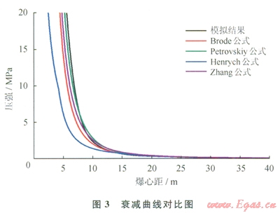 1)本文模擬過(guò)程中沖擊波荷載的峰值和衰減曲線(xiàn)與4種經(jīng)驗(yàn)公式基本一致,滿(mǎn)足工程精度要求。