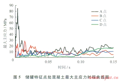 C點(diǎn)在4.5ms時(shí)也出現(xiàn)了一個(gè)l0.7MPa的脈沖峰值,原因同上;在24.8ms出現(xiàn)一個(gè)ll.9MPa的峰值響應(yīng),是由于空氣沖擊波波陣面?zhèn)鞑サ?span lang="EN-US">C點(diǎn)所致,其后應(yīng)力急劇下降并伴有高頻鋸齒振蕩[16]。從圖5中可以看出D點(diǎn)在80ms以前應(yīng)力持續(xù)小幅振蕩,80ms以后為大幅低頻響應(yīng),如3.1節(jié)中所述,這一現(xiàn)象與其特殊的位置和構(gòu)造有關(guān),爆炸沖擊波在此處連續(xù)作用于罐體,導(dǎo)致罐體疲勞損傷??傮w來(lái)說(shuō),A、B點(diǎn)雖未發(fā)生破壞,但均已處于較高的應(yīng)力水平,C點(diǎn)至F點(diǎn)混凝土的應(yīng)力響應(yīng)均在安全范圍之內(nèi),這也印證了前述900kg當(dāng)量為罐體抗爆極限值的結(jié)論。