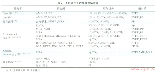 此外,由于單一吸收劑不能完全滿足高再生性能與高吸收速率,研究者們在混合吸收劑的探索中取得了較大進展。常用的活化添加劑有醇胺、烯胺以及脂肪胺等。Wongrong等[58]發(fā)現(xiàn)在MEA中添加甘氨酸鈉溶液吸收效果有較大改善。Chen等[59]考察了6種不同配比的MEA/MDEA和PG/MDEA混合液,發(fā)現(xiàn)當MDEA在混合液中比例為3:2時,脫除效率可達99%,并且反應更持久。楊波等[60]在氨基酸鉀中加入活化劑哌嗪(PZ)后,捕集濃度為15%的CO2模擬煙氣,CO2脫除率得到不斷提升。晏水平[53]通過大量實驗研究了不同配比混合吸收劑的吸收與再生性能,發(fā)現(xiàn)在三級胺溶液中添加中等含量活化劑時性能最佳。表2總結了部分國內外學者進行膜吸收試驗的條件及參數(shù)。綜上所述,MEA/TEA、PZ/TEA、MEA/MDEA、PZ/MDEA、MEA/AMP、PZ/AMP和PZ/DEA等混合吸收劑體現(xiàn)了良好的綜合性能。因此,采用具有高CO2吸收和再生性能的吸收劑組成的混合吸收劑理論上能獲得較好的CO2吸收與再生綜合性能。所以,在規(guī)?;瘧弥?,應當根據(jù)實際情況進行適當?shù)蛘_定最優(yōu)的活化劑種類與濃度,達到最佳吸收效果,找到一種高效吸收與再生的吸收劑。