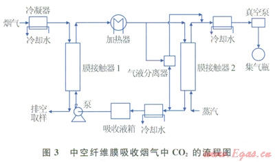 為研究不同來源原料氣下膜吸收法的吸收與解吸特性,比較傳統(tǒng)與非傳統(tǒng)再生方法的差異,改善當前解吸能耗大、能源浪費等問題,筆者提出一種采用中空纖維膜接觸器分離煙氣中CO2的方法及系統(tǒng)(圖3),試驗流程主要包括煙氣冷凝、膜吸收以及CO2解吸再生3大部分。燃煤尾氣經(jīng)煙氣冷凝器降溫后,送入中空纖維膜接觸器1,與吸收劑充分反應,其中CO2被吸收,吸收富液經(jīng)過加熱器,在中空纖維膜接觸器2中減壓再生或氣液分離器中分離出CO2,最后通過真空泵調節(jié)真空度,收集高濃度CO2氣體。而再生后的吸收貧液則經(jīng)過冷凝器降溫返回吸收液箱,進行連續(xù)循環(huán)流動試驗。同時此方法也可以采用模擬煙氣進行試驗,與實際煙氣對比研究。該系統(tǒng)首次對煤、天然氣、生物質產(chǎn)氣鍋爐實際煙氣進行排放處理,同時也可對周期性循環(huán)進行單根、串聯(lián)與并聯(lián)膜組件吸收試驗,對比CO2傳統(tǒng)與非傳統(tǒng)再生試驗,研究水蒸氣、N2等不同吹掃氣氛下的CO2回收特性以及考察真空度變化對CO2純度的影響[77]。