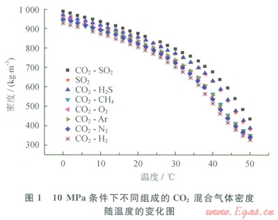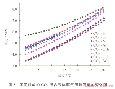 從圖l可以看出,與純CO2相比,SO2是唯一增加CO2混合氣體密度的組分,H2S對 CO2混合氣體密度影響最小,而H2對CO2混合氣體密度影響最大。