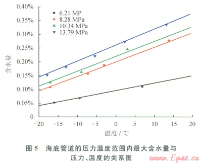 2)雜質(zhì)的存在會對CO2輸送管道的安全運行產(chǎn)生極大的影響,特別是游離水的出現(xiàn)。當(dāng)輸送過程中含水量超過水的溶解度極限時,管內(nèi)會析出游離水,游離水的出現(xiàn)會對CO2輸送管道的設(shè)計操作、腐蝕及CO2水合物生成產(chǎn)生負(fù)面影響,因此,需要設(shè)定CO2輸送管道最大允許含水量的規(guī)范。