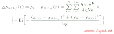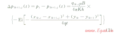 上面就完成了第一個Dt時間步長下各線匯單元及總產(chǎn)量計算;對于各線匯單元而言,由于產(chǎn)量會隨生產(chǎn)時間發(fā)生變化,這樣就需要利用時間疊加來求得任意時刻的值。設(shè)時間段步長為Dt,當時t=mDt(第m個時間段的結(jié)尾),則對第k+1條裂縫的第j個線匯,可得到:
