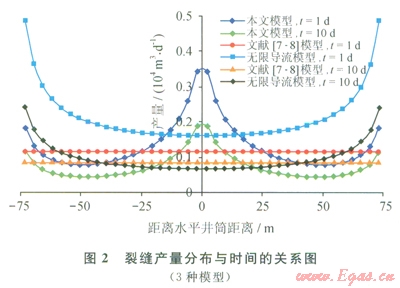 圖2是3種模型第l條裂縫的產(chǎn)量分布對比結(jié)果。采用無限導流模型計算結(jié)果表明,由于沒有考慮裂縫內(nèi)的壓力降落,在生產(chǎn)初期(t=ld)裂縫內(nèi)的產(chǎn)量分布為“U”形,裂縫兩端產(chǎn)量相對較高,這與本文參考文獻[15]規(guī)律一致;本文模型考慮了裂縫產(chǎn)量非均勻分布以及裂縫內(nèi)的壓力損失,裂縫產(chǎn)量在水平井筒附近出現(xiàn)局部峰值,且隨裂縫內(nèi)壓力損失增大,井筒附近裂縫產(chǎn)量的峰值越明顯,這是由于越靠近井簡裂縫生產(chǎn)壓差越大,裂縫產(chǎn)量越高造成的;由于裂縫段內(nèi)相互干擾,隨著生產(chǎn)時間的增加,裂縫產(chǎn)量分布趨于均勻,但由于水平井筒壓力最低,裂縫上產(chǎn)量分布為近似“雙U”型,這與本文參考文獻[l4]規(guī)律相符合。