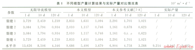 分別按照裂縫無限導流模型、本文模型以及本文參考文獻[7-8]的計算結(jié)果與實際產(chǎn)量對比(表1)??梢钥闯?,本文模型的計算結(jié)果從初期到穩(wěn)定生產(chǎn)階段最接近,表明本文模型準確性高。從3種模型計算結(jié)果的對比來看:無限導流模型計算生產(chǎn)ld時的產(chǎn)量為13.626×104m3/d、生產(chǎn)120d后產(chǎn)量為4.346×104m3/a,遠高于實際產(chǎn)量,表明不能忽略裂縫內(nèi)壓力損失的影響。從本文參考文獻[7-8]模型的計算結(jié)果與實際產(chǎn)量對比可以看出,生產(chǎn)初期差別較大(分別為6.904×104m3/a和9.214×104m3/d),而在生產(chǎn)120d的差別變小,這表明采用均勻產(chǎn)量分布的假設(shè)與實際情況存在較大偏差。