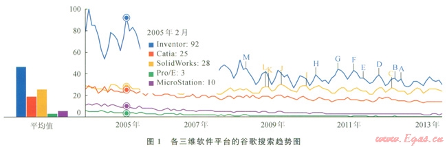 Inventor作為Autodesk公司推出的一款三維可視化軟件,具有三維建模、協(xié)同工作、信息管理和技術(shù)支持等強大功能,在該平臺可以實現(xiàn)創(chuàng)建三維模型、二維工程圖,其具有的連接網(wǎng)絡功能可以進行同項目組員間的協(xié)同,為同項目組人員間數(shù)據(jù)共享和思想交流提供了極大方便。另外,通過谷歌趨勢檢索比較圖l,從另一個側(cè)面也反映出了該軟件具有更高的關注度和更大的應用范圍。