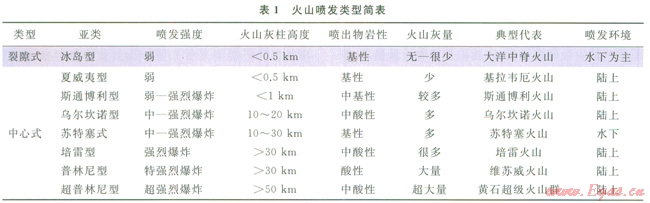火山灰的形成數(shù)量和分布范圍主要受火山噴發(fā)類型和規(guī)模控制?;鹕絿姲l(fā)按巖漿的通道分為2大類:①裂隙式噴發(fā),又稱冰島型火山噴發(fā),巖漿沿地殼中的斷裂帶溢出地表,通常溫和寧靜,噴出物多為基性熔漿,碎屑和氣體較少;②中心式噴發(fā),巖漿通過管狀通道噴出地表,通常產(chǎn)生爆炸,噴出物多為中酸性熔漿,碎屑和氣體豐富。根據(jù)噴出物性質(zhì)和噴發(fā)強(qiáng)烈程度,火山噴發(fā)可分為多種類型(表1),其中普林尼型等強(qiáng)烈爆炸式火山噴發(fā)形成的火山灰量最大。