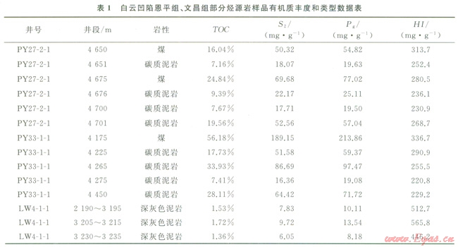烴源巖樣品有機(jī)地球化學(xué)分析表明(表1、圖l),恩平組淺湖相、沼澤相烴源巖殘余有機(jī)碳含量(TOC)變化大(1.12%~56.18%),生烴潛力指數(shù)(Pg)較高(0.56~97.47mg/g);氫指數(shù)(HI)較低,介于50~300mg/g,有機(jī)質(zhì)類型為偏腐殖型干酪根;Pr/Ph為1.6~5.9,沉積環(huán)境變化大;C29規(guī)則甾烷優(yōu)勢(shì),貧4-甲基甾烷系列;富含陸源三萜類生物標(biāo)志物,如W、T樹脂化合物含量高,奧利烷含量較低—中等。文昌組湖相烴源巖殘余有機(jī)碳含量適中(1.00%~2.50%),生烴潛力指數(shù)較高(8.18~l3.64mg/g);氫指數(shù)較高,介于446~566mg/g,有機(jī)質(zhì)類型為偏腐泥型干酪根;Pr/Ph為1.4~1.7,沉積環(huán)境為還原環(huán)境;與盆地北部珠一地區(qū)富生烴凹陷文昌組烴源巖特征不一樣,白云凹陷文昌組來源于藻類的C27規(guī)則甾烷含量較高,而貧4-甲基甾烷系列,推測(cè)當(dāng)時(shí)可能因處于不同的湖泊環(huán)境,其水生生物的種類也不同而導(dǎo)致;貧陸源三萜類生物標(biāo)志物,如W、T樹脂化合物和奧利烷含量低(或難于檢測(cè))。烴源巖有機(jī)質(zhì)及生態(tài)組分中富含無定型和浮游藻類。