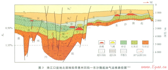 珠江口盆地北部坳陷帶(圖2、3)處于南海北部大陸邊緣陸架上,盆地基底是燕山期島弧帶,盆地形成經(jīng)歷古近紀斷陷、新近紀坳陷與新構(gòu)造期3個階段。其中始新統(tǒng)文昌組沉積末期盆地受到強烈改造,地層遭受較大規(guī)模剝蝕。盆地二級構(gòu)造單元有珠一坳陷和珠三坳陷等。三級構(gòu)造單元包括10多個凹陷和凸起。凹陷是潛在的生烴單元,但都比較破碎,多數(shù)凹陷被次級凸起進一步分隔成多個洼陷。洼陷才是最基本的生烴單元,多數(shù)洼陷呈“肉(古近系)厚皮(新近系)薄”特征。烴源巖為始新統(tǒng)文昌組中深湖相泥巖、漸新統(tǒng)恩平組湖沼相煤系地層[3],部分凹陷可能殘留有中生代海相—海陸過渡相烴源巖。該區(qū)域地溫梯度及大地熱流值分別為36.6±6.0℃/km和66.1±8mW/m2[15],屬于熱盆。始新統(tǒng)文昌組中深湖相泥巖烴源巖有機碳含量介于0.50%~4.88%,平均為1.22%,以偏腐泥混合型干酪根為主,埋藏深度處在生油窗范圍,主要生油,是主力生油巖;恩平組因埋藏淺、熱演化程度低在珠一坳陷生成少量石油,在珠三坳陷生成部分天然氣。因此主力烴源巖為始新統(tǒng)文昌組,比較單一,決定了以油為主的縱向分布特征[3]。已發(fā)現(xiàn)的生油洼陷有惠州26洼、陸豐l3洼、番禺4洼、恩平l7洼、珠三坳陷文昌B洼等。縱向上石油分布在基底組合、始新統(tǒng)文昌組—恩平組下組合、漸新統(tǒng)珠海組—下中新統(tǒng)珠江組中組合、中上新統(tǒng)粵海組—萬山組上組合。珠江口盆地北部新構(gòu)造活動劇烈,石油晚期運移活躍,目前發(fā)現(xiàn)的石油主要集中在中組合,其他組合是下一步的油氣勘探方向。