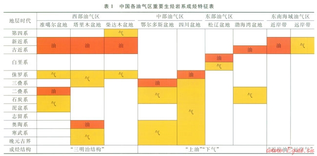 中國不同盆地群的盆地在縱向上有不同的油氣(包括常規(guī)油氣和非常規(guī)油氣)成烴樣式(表1)。如鄂爾多斯盆地油氣田呈“下氣(古生界)上油(三疊系—侏羅系)”格局、松遼盆地油氣田呈“下氣(下白堊統(tǒng))上油(上白堊統(tǒng))”格局,其他盆地也呈現(xiàn)出油氣田在空間上有序分布的特征(表1)。但以油氣區(qū)(盆地群)為單元,進而討論中國海陸總體油氣田分布規(guī)律的研究并不多見,而進一步歸納全國油氣田空間分布模式、揭示其成因,準確把握油氣田分布規(guī)律,對于指導(dǎo)油氣領(lǐng)域勘探有著極其重要的意義。