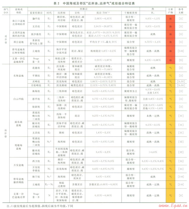 中國東南沿海油氣區(qū)指東海海域和南海海域油氣區(qū)。油氣區(qū)內(nèi)盆地的基底是印支、燕山期造山帶,盆地屬于邊緣海盆地,結(jié)構(gòu)呈斷陷—坳陷,充填的主要地層為新生界(局部有中生代殘留盆地)。盆地的烴源巖時代相對單一,主要發(fā)育一套古近紀—新近紀地層[2-13],在不同盆地生油氣性質(zhì)不同,從油氣田分布看,可以分成近岸原油帶和遠岸天然氣帶(圖1、表2)。