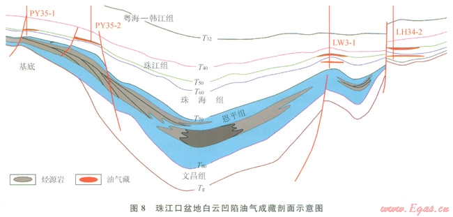 珠江口盆地位于南海北部大陸邊緣東段,白云凹陷位于珠江口盆地南部坳陷帶珠二坳陷內(nèi),凹陷基底是燕山期島弧帶,凹陷內(nèi)新生代地層發(fā)育。白云凹陷演化歷經(jīng)了古近紀裂陷期,早、中中新世坳陷期和晚中新世以來的新構(gòu)造期[20]。白云凹陷發(fā)育始新統(tǒng)文昌組中深湖相泥巖、下漸新統(tǒng)恩平組海陸過渡相煤系地層與海灣相泥巖、上漸新統(tǒng)珠海組海相泥巖共計3套烴源巖(圖8)。恩平組海陸過渡相煤系地層海灣相泥巖是主力烴源巖,其中暗色泥巖總有機碳含量介于1.0%~l.5%,展布規(guī)模大,烴源巖母質(zhì)類型多為偏腐殖混合型及腐殖型。恩平組煤系烴源巖主要發(fā)育在凹陷北部斜坡區(qū)域,展布范圍超過5000km2,煤層發(fā)育,在PY33-1-1井恩平組有煤20層,累計厚度為22.98m[18]。文昌組中深湖相烴源巖有機碳含量介于0.50%~4.88%,平均為1.22%,以偏腐泥混合型十酪根為主。白云凹陷位于洋陸過渡區(qū),地溫梯度及大地熱流值分別高達4.5℃/100m和77.5mW/m2[15],屬于超熱盆。白云凹陷恩平組底部烴源巖現(xiàn)今成熟度在凹陷中心部位R。為0.5%~2.0%,主凹最深處尺。達到2.0%,在凹陷邊緣部位R。介于0.5%~0.7%;有機質(zhì)熱演化多處在成熟~高熟凝析油及生氣階段,其烴類產(chǎn)物以大量天然氣及少量輕質(zhì)油及凝析油為主;主洼以生氣為主,周邊的衛(wèi)星洼陷埋藏淺,以生油為主。此外,文昌組烴源巖在白云凹陷斜坡帶現(xiàn)今R。為2.1%,表明文昌組烴源巖也已經(jīng)達到生氣階段。白云凹陷及其鄰區(qū)發(fā)育漸新統(tǒng)儲蓋組合和新近系儲蓋組合,油氣勘探都有重要發(fā)現(xiàn);目前的油氣勘探發(fā)現(xiàn)多在珠江組;預(yù)測主力儲蓋組合為恩平組與珠海組。