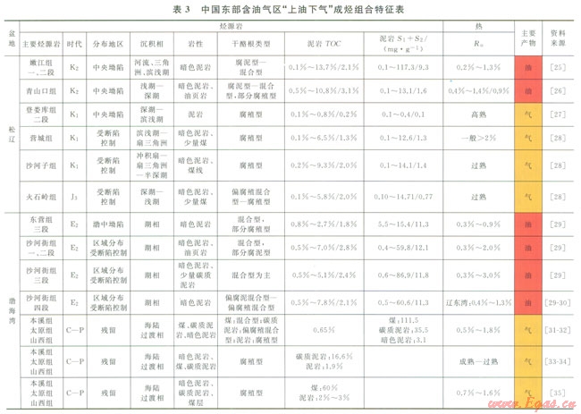 我國陸地區(qū)東部油氣區(qū)包括東北吉黑中新生代裂谷區(qū)(主要包括松遼盆地、海拉爾盆地、二連盆地、大楊樹盆地、三江盆地等,主要形成于晚侏羅世—白堊紀;僅依蘭—伊通地塹系形成于古近紀)、渤海灣盆地(主要包括下遼河坳陷、遼東灣坳陷、渤中坳陷、濟陽坳陷、黃驊坳陷、冀中坳陷、臨清坳陷、埕寧隆起、滄縣隆起、內(nèi)黃隆起等,主體形成于古近紀)、南華北盆地、南襄盆地、江漢盆地、北黃海盆地和蘇北—南黃海盆地等(圖1)。這些盆地基底為克拉通基底或海西—印支褶皺區(qū)。盆地成盆期及其期次不同、各期盆地原型也不同,經(jīng)歷的改造作用差異巨大,多為殘疊甕地,即多期原型盆地的殘余疊合在一起,烴源巖發(fā)育程度不同(表3)。受區(qū)域熱流場和埋藏作用的綜合控制,烴源巖經(jīng)受不同的熱作用,導(dǎo)致下部層系烴源巖以生氣為主,上部層系烴源巖以生油為主,形成“下氣上油”兩類成烴模式。如松遼盆地白堊系下部生成天然氣、白堊系上部生成巨量石油,呈現(xiàn)出下生氣、上生油的格局;渤海灣盆地前新生代殘余盆地生成天然氣、古近系盆地生成巨量石油,也呈現(xiàn)出“下氣上油”的特點。