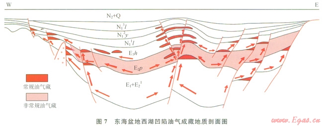 東海盆地位于東海陸架區(qū),基底是燕山期陸緣花崗巖帶,新生代歷經(jīng)裂陷期、坳陷期及新構(gòu)造期3大構(gòu)造階段。其中裂陷期為古新世—始新世,坳陷期為漸新世—中新世,上新世—第四紀為新構(gòu)造期。東海盆地以新生代沉積地層為主,從古新統(tǒng)至第四系均有發(fā)育。該盆地經(jīng)歷了5次主要構(gòu)造改造作用,特別顯著的是發(fā)生過多期正反轉(zhuǎn)(圖6、7)。東海貧地呈二坳二隆構(gòu)造格局。西部坳陷帶(長江坳陷、臺北坳陷)、中央隆起帶(虎皮礁隆起、海礁隆起、漁山東隆起)、東部坳陷帶(福江凹陷、西湖凹陷、釣北凹陷)和東部隆起帶(釣魚島隆褶帶,即陸架外緣隆起)。東海盆地形成于太平洋板塊俯沖導(dǎo)致的弧后擴張作用;隨著俯沖帶的不斷東撤,盆地內(nèi)部呈由西向東逐漸變新的構(gòu)造遷移特征,沉積—沉降中心逐漸東移,形成了凹陷之間構(gòu)造—沉積演化的差異。古新世裂陷主要發(fā)生在東海盆地的西部坳陷帶,始新世—漸新世裂陷主要發(fā)生在其東部坳陷帶。