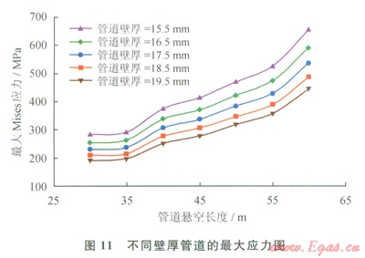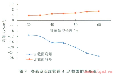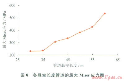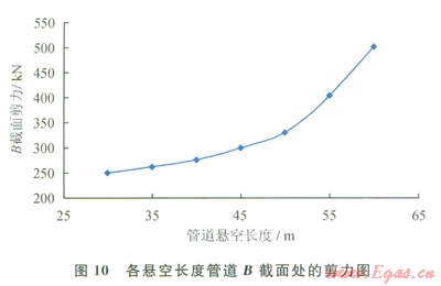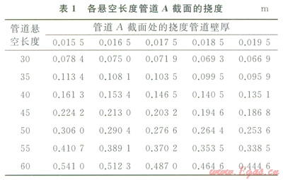 2)保持其他工況參數(shù)不變,改變懸空長度分別為35m、40m、45m、50m、55m、60m時,汁算管道最大應(yīng)力、彎矩和撓度(見圖8~10和表l)??梢姡航孛?span lang="EN-US">A處撓度最大,截面B處剪力最大,管道易在截面B處發(fā)生剪力破壞。當(dāng)懸空長度為55m時,管道已接近失效上限,仍處于安全范圍。60m時,管道最大應(yīng)力大于485MPa,此時管道失穩(wěn),超出安全極限,理論上已失效。