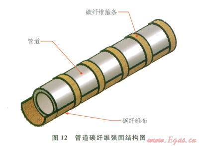 碳纖維材料的多項力學(xué)指標(biāo)優(yōu)于鋼材,圖l2為碳纖維布粘貼在管道下半圓周面示意圖。用間距分布的環(huán)形碳纖維箍條周向預(yù)緊粘貼,箍條有助于防止下部碳纖維布剝離管道,同時在預(yù)緊力的作用下使碳纖維布與管道粘貼更緊密,且使強固材料對管道有了一定的拉力。參考相關(guān)實驗結(jié)果[12],管道上半圓周表面可不粘貼強固材料,合理布置下半圓周強固材料,實際上間接增加了下半圓周管道的壁厚。上述碳纖維強固措施對管道整體均勻性和結(jié)構(gòu)對稱性是負(fù)面的,但從前面力學(xué)分析可知,這種措施使管道整體力學(xué)性能得到優(yōu)化,因此這種負(fù)面影響是可以忽略的。碳纖維材料是從兩個方面實現(xiàn)管道力學(xué)性能優(yōu)化的:①管材結(jié)構(gòu)(壁厚);②碳纖維材料自身抗拉伸性能。