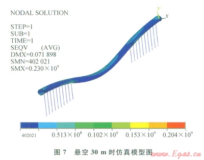 懸空30m時,仿真結(jié)果如圖7,在沿管軸方向(圖中x方向)的對稱中心處管道變形位移最大,在兩固支端、埋地與懸空的過渡處、對稱中心處應(yīng)力集中較明顯,沿豎直方向(圖7中y方向)管道上部應(yīng)力集中比管道下部明顯,最大應(yīng)力為230MPa,小于屈服極限485MPa,所以管道處于安全范圍內(nèi)。