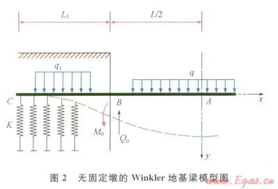 圖2為模型簡圖,與彈塑性地基模型相比,埋地段影響區(qū)為彈性變形區(qū)(無塑性變形)。管道變形前軸線為x軸,y軸過對稱中心,管道各截面的y坐標(biāo)值為對應(yīng)部分的管道撓度,任意截面的轉(zhuǎn)矩為M,M0和Q0是管道懸空段與埋地段交界處的彎矩和剪力。利用Winkler假定,通過懸管長度(L)、埋地管長(L1)、懸空段載荷(q)(管自重和介質(zhì)重)、埋地段載荷q0(圖3中上覆土重q土=H·L·D·r土·g、管自重、介質(zhì)重)、已知地基系數(shù)(K0),在對管道兩端固支的情況下求管道各微段的撓度(y)、轉(zhuǎn)矩(M)、豎直剪力(Q)值[8-10]。