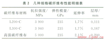 纖維強固材料(Fiber Reinforced Plastics,FRP)括:碳纖維(CFRP)、玻璃纖維(GFRP)和芳綸纖維(AFRP),碳纖維平均抗拉強度為4210MPa(相當(dāng)于碳素鋼的l0倍),平均彈性模量為235×109MPa(與鋼材接近),熱膨脹系數(shù)與鋼材相仿,耐腐蝕、抗老化、耐溫、抗蠕變能力較好,且厚度小、質(zhì)量輕、層間剪切力高、穩(wěn)定性好、纏繞方式靈活易操作,大量應(yīng)用于航天、兵器、建筑和化工領(lǐng)域,表2列舉了3種碳纖維布[11]性能。