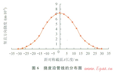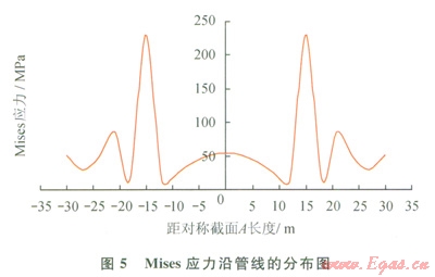 1)圖5、6表示了現(xiàn)場實際懸空長度為30m時,應(yīng)力和撓度沿管線的分布情況,可見Mises應(yīng)力和豎直方向應(yīng)力在±15m處最大,而最大撓度出現(xiàn)在模型C-C處,也就是懸空水平對稱處。