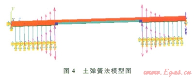 建立有限元物理模型時,將埋地管段所受到土壤支反力用一定間距的若干根彈簧代替,彈簧與管下表面呈點一面接觸。合理選取埋地管段長度,使管模型兩端不受懸空段的影響,從而實現(xiàn)管兩端的固支模型,一般工程上取單側(cè)埋地段長度為懸空段長度的l/2,這時管兩端可近似為固支[10](圖4)。